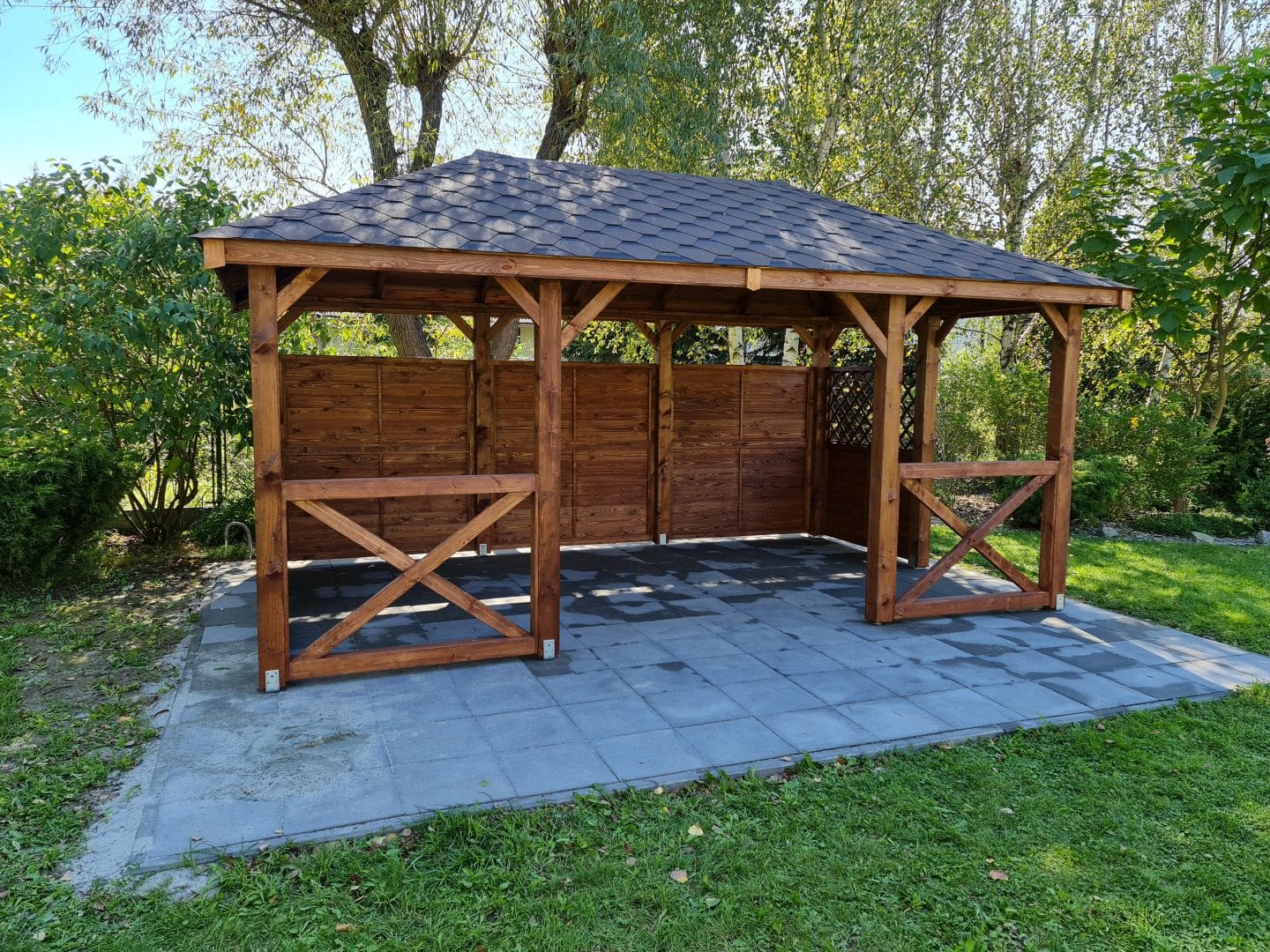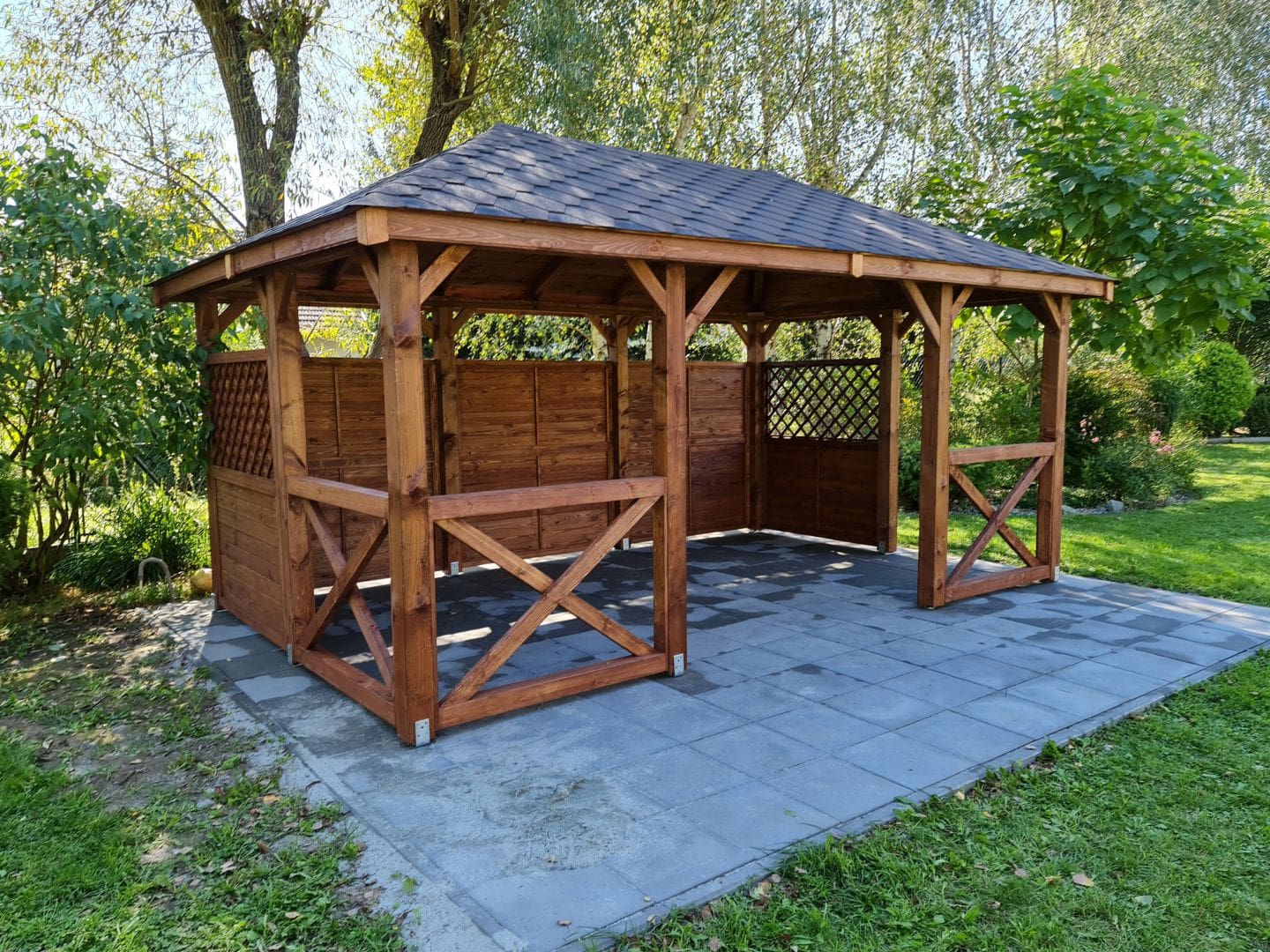 Altana ogrodowa GABI MIX o wymiarach 3×5 m z częściową zabudową, która tworzy przyjemną i osłoniętą przestrzeń do wypoczynku. Konstrukcja wykonana z trwałego certyfikowanego drewna świerkowego, osadzona na masywnych słupach i uzupełniona o dekoracyjne krzyżowe balustrady oraz panele z kratką. Wszystkie elementy są dokładnie szlifowane i frezowane, a zastosowane drewno suszone komorowo zapewnia stabilność oraz odporność na warunki atmosferyczne.