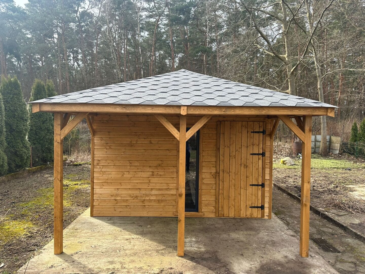 Dziękujemy za zainteresowanie naszą firmą. Mamy do zaoferowania domek narzędziowy z tarasem – Pomieszczenie gospodarcze 3m x 4m + taras 3m x 1,5m wykonaną z drewna świerkowego ( bez podłogi ). Domek posiada wentylacje między ścianami a dachem. Wszystkie elementy drewniane są staranie szlifowane oraz frezowane. W trosce o klienta oferujemy drewno suszone komorowo. Zapraszamy do zapoznania się z naszą ofertą, a przekonacie się, Państwo że to dobry wybór. Wykonujemy konstrukcje pod wymiar Klienta , domek można konfigurować w dowolny sposób. Udzielamy pisemnej gwarancji !!