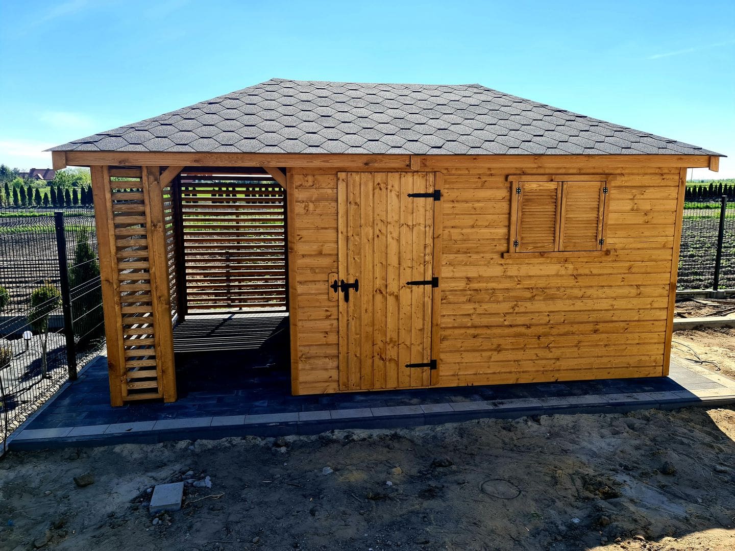 KRYSTIAN 3×5 m to domek narzędziowy, który łączy funkcję schowka z przewiewną przestrzenią na drewno lub sprzęt. Część zamknięta 3×3,5 m sprawdzi się jako praktyczne pomieszczenie gospodarcze, natomiast drewutnia 3×1,5 m umożliwia wygodne i uporządkowane składowanie opału. Konstrukcja wykonana z solidnego certyfikowanego drewna świerkowego (bez podłogi), z elementami szlifowanymi i frezowanymi. Domek posiada wentylację między ścianami a dachem, a zastosowane drewno suszone komorowo zapewnia trwałość i odporność na warunki atmosferyczne.