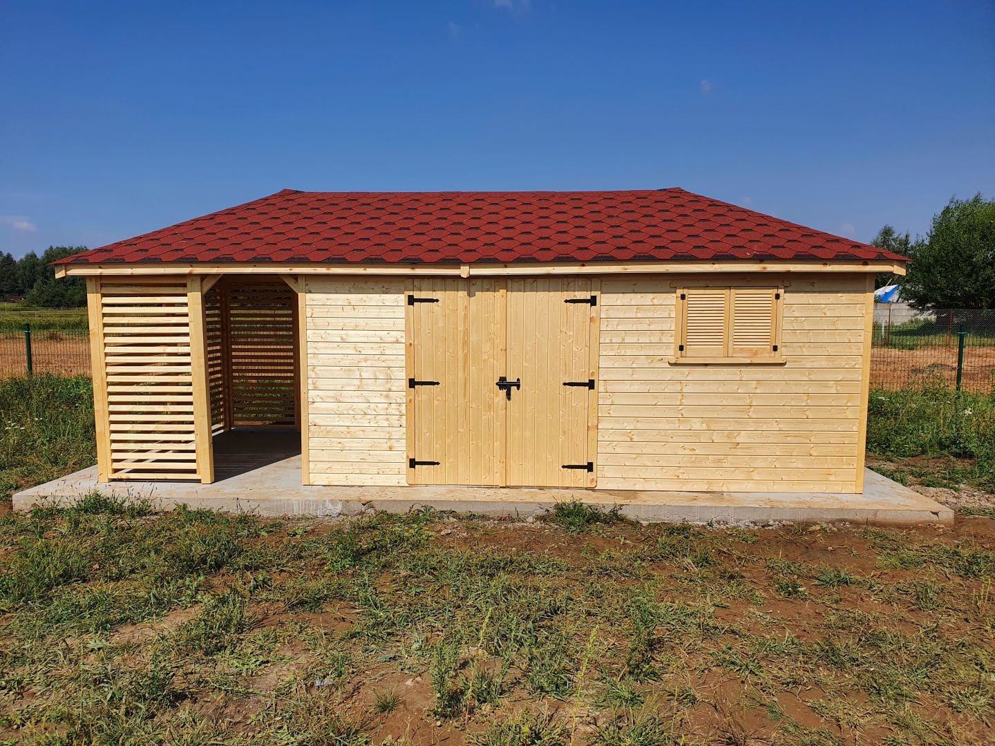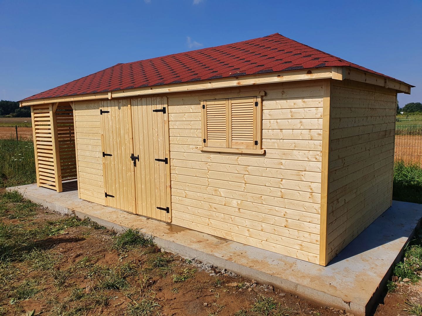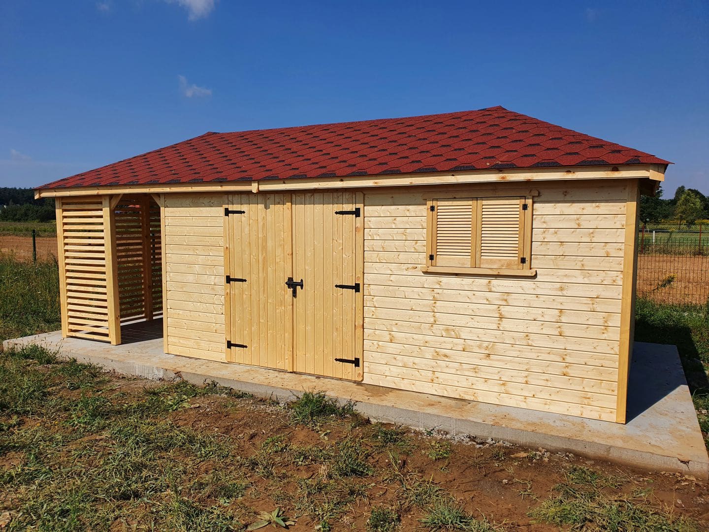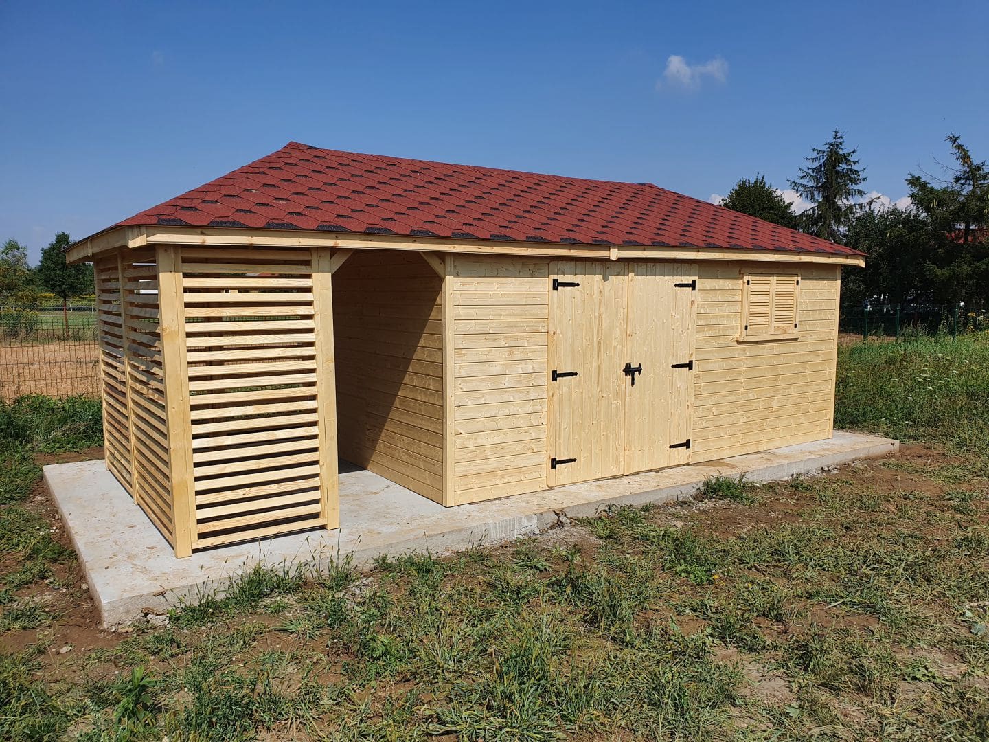 Dziękujemy za zainteresowanie naszą firmą. Mamy do zaoferowania domek narzędziowy z drewutnią o wymiarach – Pomieszczenie gospodarcze 3m x 5m + drewutnia 3m x 2m wykonaną z drewna świerkowego ( bez podłogi ). Domek posiada wentylacje między ścianami a dachem. Wszystkie elementy drewniane są staranie szlifowanę oraz frezowane. W trosce o klienta oferujemy drewno suszone komorowo. Zapraszamy do zapoznania się z naszą ofertą, a przekonacie się, Państwo że to dobry wybór. Wykonujemy konstrukcje pod wymiar Klienta , domek można konfigurować w dowolny sposób. Udzielamy pisemnej gwarancji !!