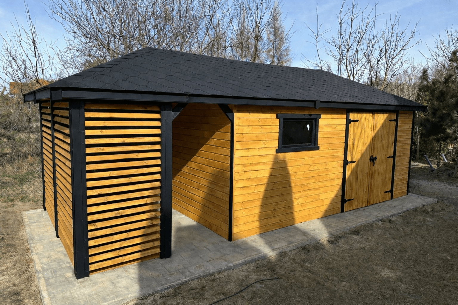 Domek narzędziowy z drewutnią o wymiarach – Pomieszczenie gospodarcze 3m x 4m + drewutnia 3m x 2m wykonaną z drewna sosnowego ( bez podłogi ). Domek posiada wentylacje między ścianami a dachem. Wszystkie elementy drewniane są staranie szlifowane oraz frezowane. W trosce o klienta oferujemy drewno suszone komorowo. Zapraszamy do zapoznania się z naszą ofertą, a przekonacie się, Państwo że to dobry wybór. Wykonujemy konstrukcje pod wymiar Klienta , domek można konfigurować w dowolny sposób. Udzielamy pisemnej gwarancji.