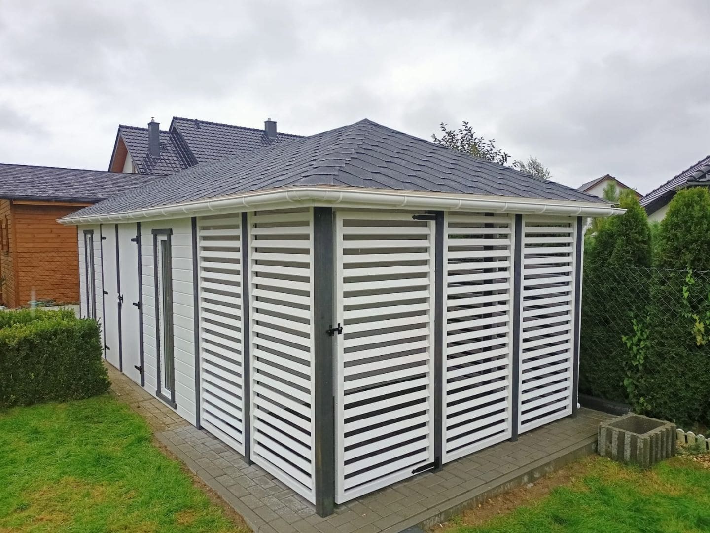 Dziękujemy za zainteresowanie naszą firmą. Mamy do zaoferowania domek narzędziowy z drewutnią o wymiarach – Pomieszczenie gospodarcze 3m x 5m + drewutnia 3m x 2m wykonaną z drewna świerkowego ( bez podłogi ). Domek posiada wentylacje między ścianami a dachem. Wszystkie elementy drewniane są staranie szlifowanę oraz frezowane. W trosce o klienta oferujemy drewno suszone komorowo. Zapraszamy do zapoznania się z naszą ofertą, a przekonacie się, Państwo że to dobry wybór. Wykonujemy konstrukcje pod wymiar Klienta , domek można konfigurować w dowolny sposób. Udzielamy pisemnej gwarancji !!