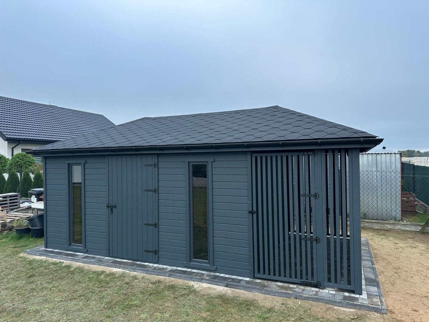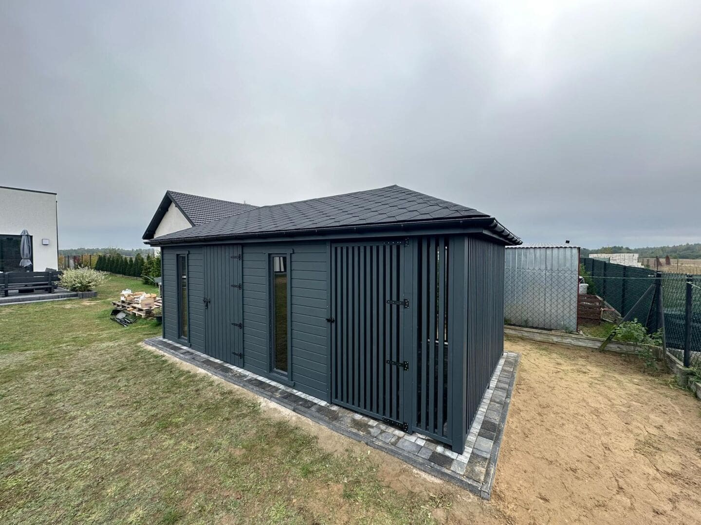 - Ścianki drewutni wykonane z kantówki w pionowe lamele