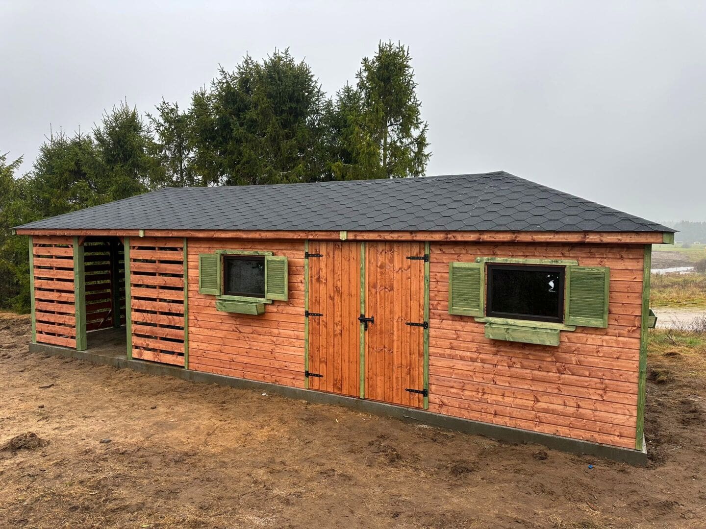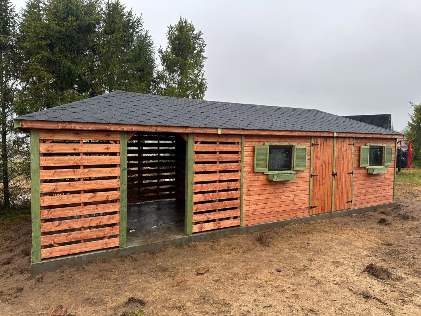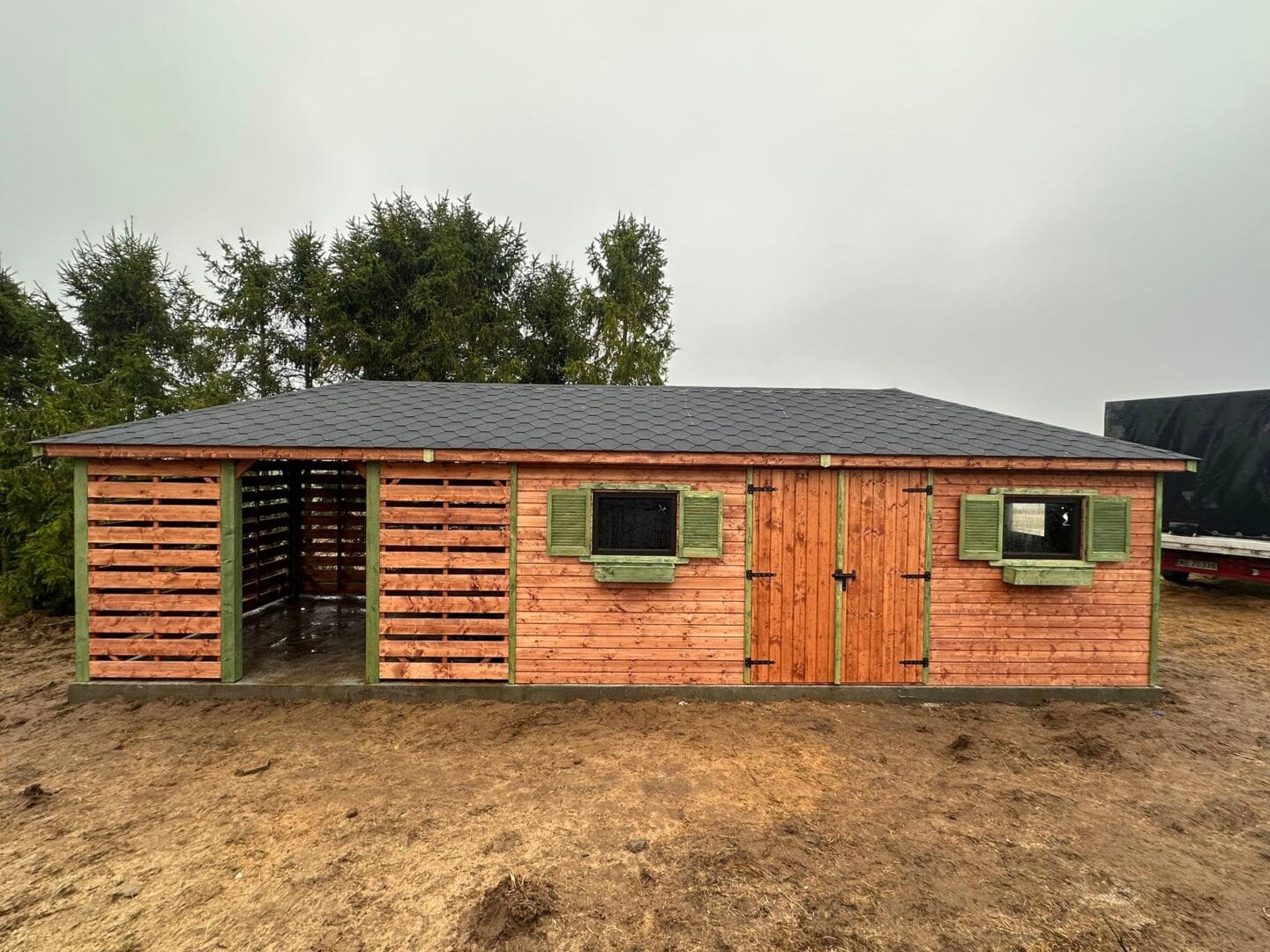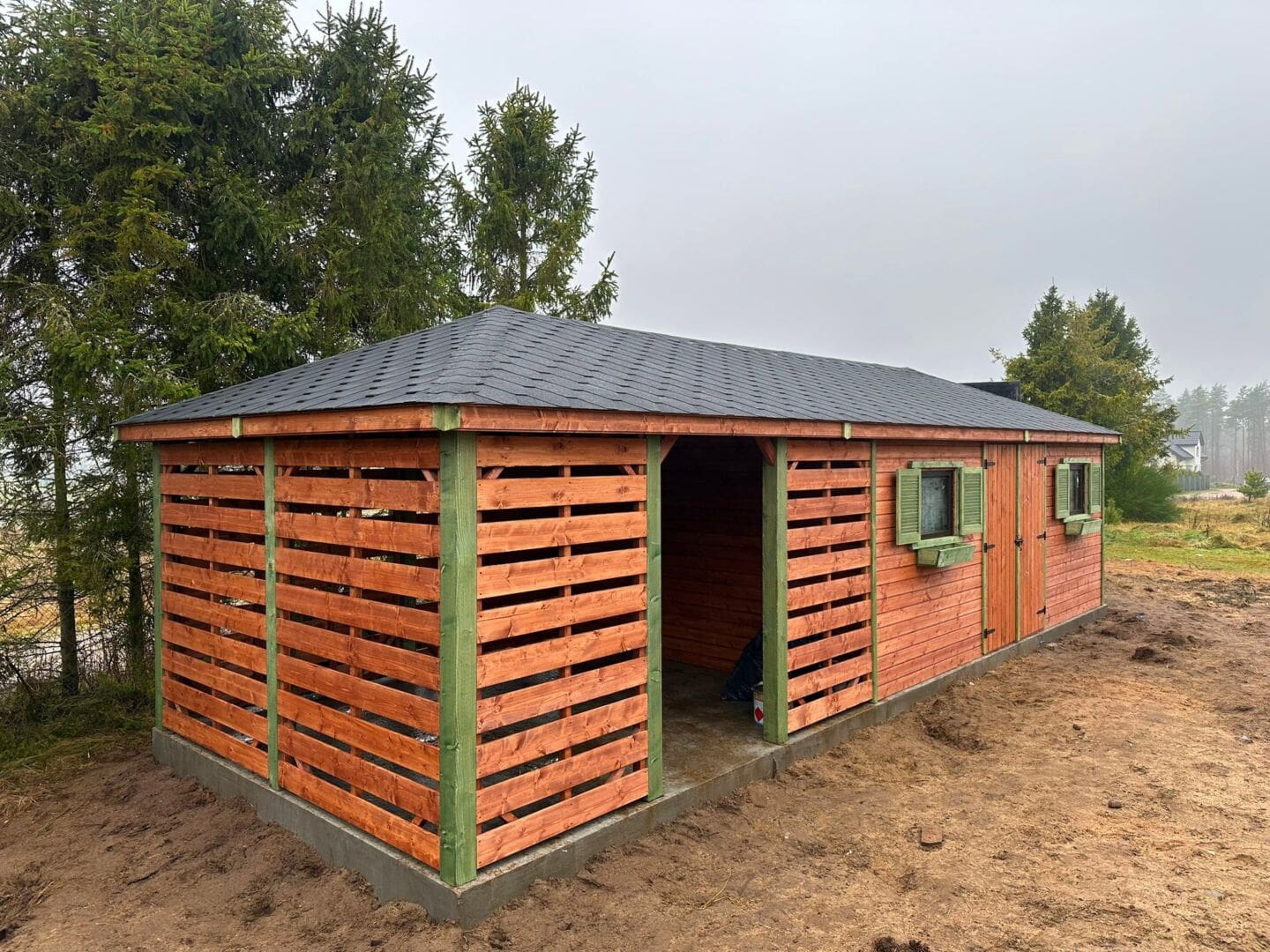 Dziękujemy za zainteresowanie naszą firmą. Mamy do zaoferowania domek narzędziowy z drewutnią o wymiarach – Pomieszczenie gospodarcze 3,5m x 6m + drewutnia 3,5m x 4m wykonaną z drewna świerkowego ( bez podłogi ). Domek posiada wentylacje między ścianami a dachem. Wszystkie elementy drewniane są staranie szlifowane oraz frezowane. W trosce o klienta oferujemy drewno suszone komorowo. Zapraszamy do zapoznania się z naszą ofertą, a przekonacie się, Państwo że to dobry wybór. Wykonujemy konstrukcje pod wymiar Klienta , domek można konfigurować w dowolny sposób. Udzielamy pisemnej gwarancji.