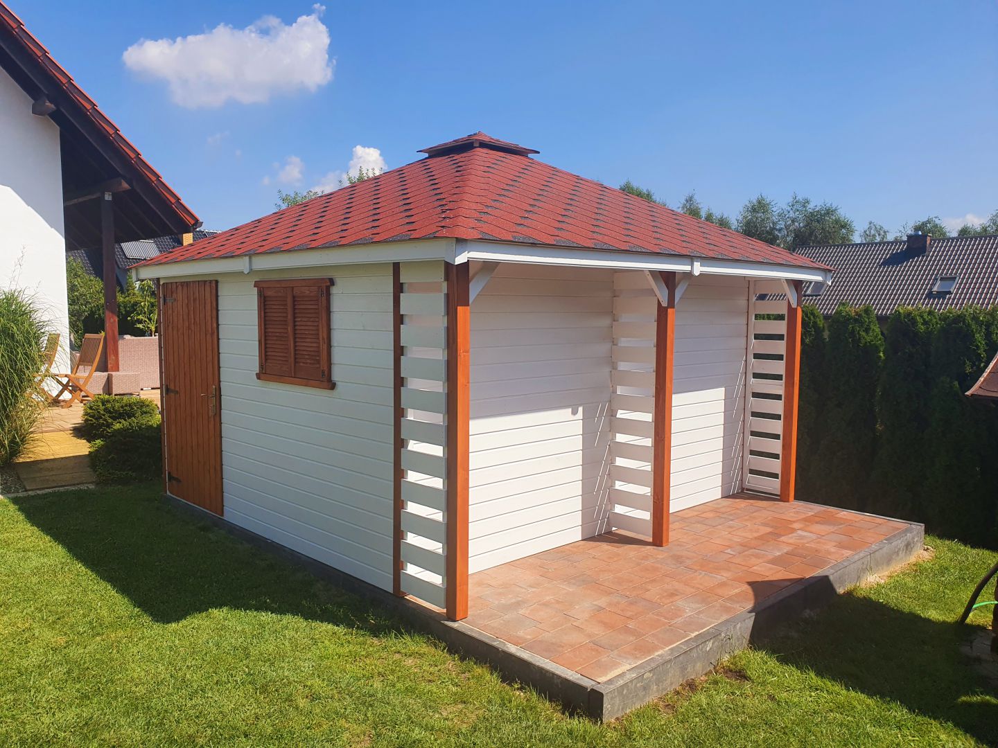 Dziękujemy za zainteresowanie naszą firmą. Mamy do zaoferowania domek narzędziowy z drewutnią o wymiarach – Pomieszczenie gospodarcze 4m x 3,5m + drewutnia 4m x 0,5m wykonaną z drewna świerkowego ( bez podłogi ). Domek posiada wentylacje między ścianami a dachem. Wszystkie elementy drewniane są staranie szlifowanę oraz frezowane. W trosce o klienta oferujemy drewno suszone komorowo. Zapraszamy do zapoznania się z naszą ofertą, a przekonacie się, Państwo że to dobry wybór. Wykonujemy konstrukcje pod wymiar Klienta , domek można konfigurować w dowolny sposób. Udzielamy pisemnej gwarancji !!