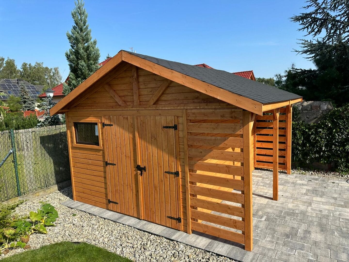 Dziękujemy za zainteresowanie naszą firmą. Mamy do zaoferowania domek narzędziowy z drewutnią o wymiarach – Pomieszczenie gospodarcze 4,5m x 3,5m + drewutnia 4.5m x 1m wykonaną z drewna świerkowego ( bez podłogi ). Domek posiada wentylacje między ścianami a dachem. Wszystkie elementy drewniane są staranie szlifowane oraz frezowane. W trosce o klienta oferujemy drewno suszone komorowo. Zapraszamy do zapoznania się z naszą ofertą, a przekonacie się, Państwo że to dobry wybór. Wykonujemy konstrukcje pod wymiar Klienta , domek można konfigurować w dowolny sposób. Udzielamy pisemnej gwarancji !!
