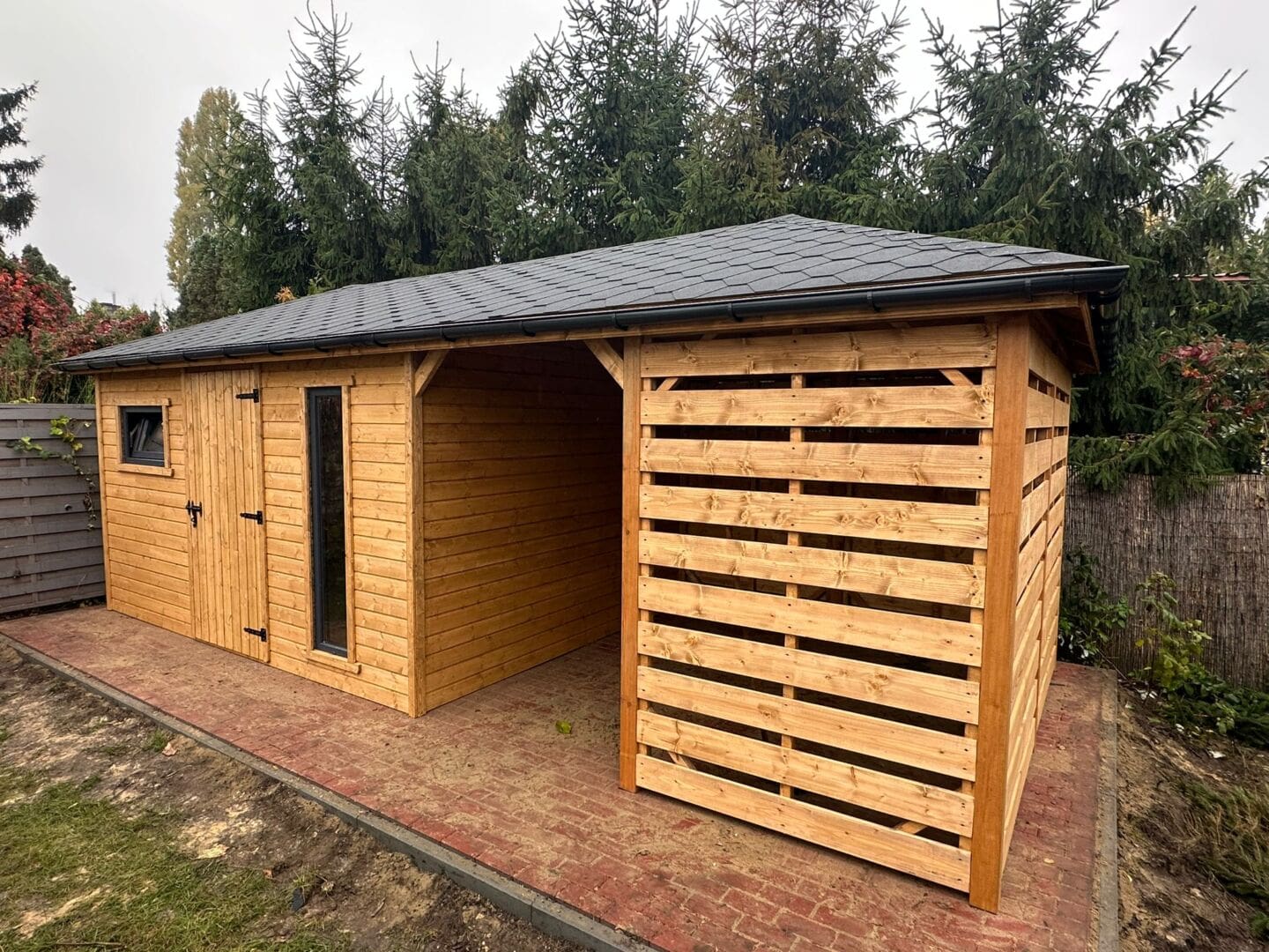 Dziękujemy za zainteresowanie naszą firmą. Mamy do zaoferowania domek narzędziowy z drewutnią o wymiarach – Pomieszczenie gospodarcze 4m x 4m + drewutnia 4m x 3m wykonaną z drewna świerkowego ( bez podłogi ). Domek posiada wentylacje między ścianami a dachem. Wszystkie elementy drewniane są staranie szlifowane oraz frezowane. W trosce o klienta oferujemy drewno suszone komorowo. Zapraszamy do zapoznania się z naszą ofertą, a przekonacie się, Państwo że to dobry wybór. Wykonujemy konstrukcje pod wymiar Klienta , domek można konfigurować w dowolny sposób. Udzielamy pisemnej gwarancji !!