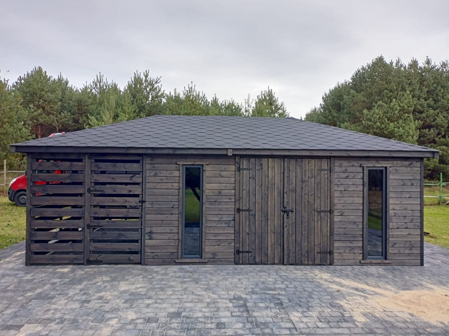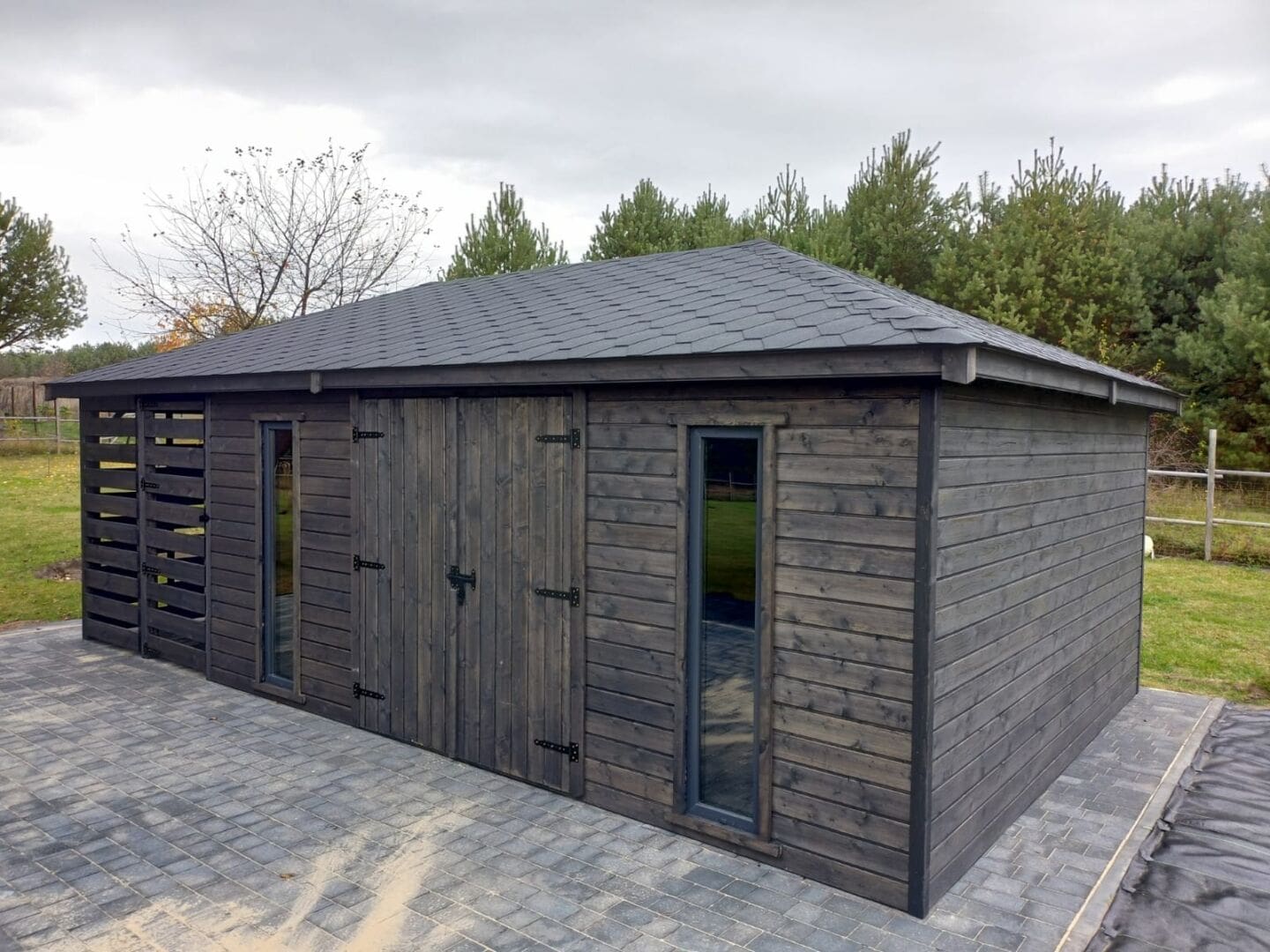 Dziękujemy za zainteresowanie naszą firmą. Mamy do zaoferowania domek narzędziowy z drewutnią o wymiarach – Pomieszczenie gospodarcze 4m x 5m + drewutnia 4m x 2m wykonaną z drewna świerkowego ( bez podłogi ). Domek posiada wentylacje między ścianami a dachem. Wszystkie elementy drewniane są staranie szlifowane oraz frezowane. W trosce o klienta oferujemy drewno suszone komorowo. Zapraszamy do zapoznania się z naszą ofertą, a przekonacie się, Państwo że to dobry wybór. Wykonujemy konstrukcje pod wymiar Klienta , domek można konfigurować w dowolny sposób. Udzielamy pisemnej gwarancji.