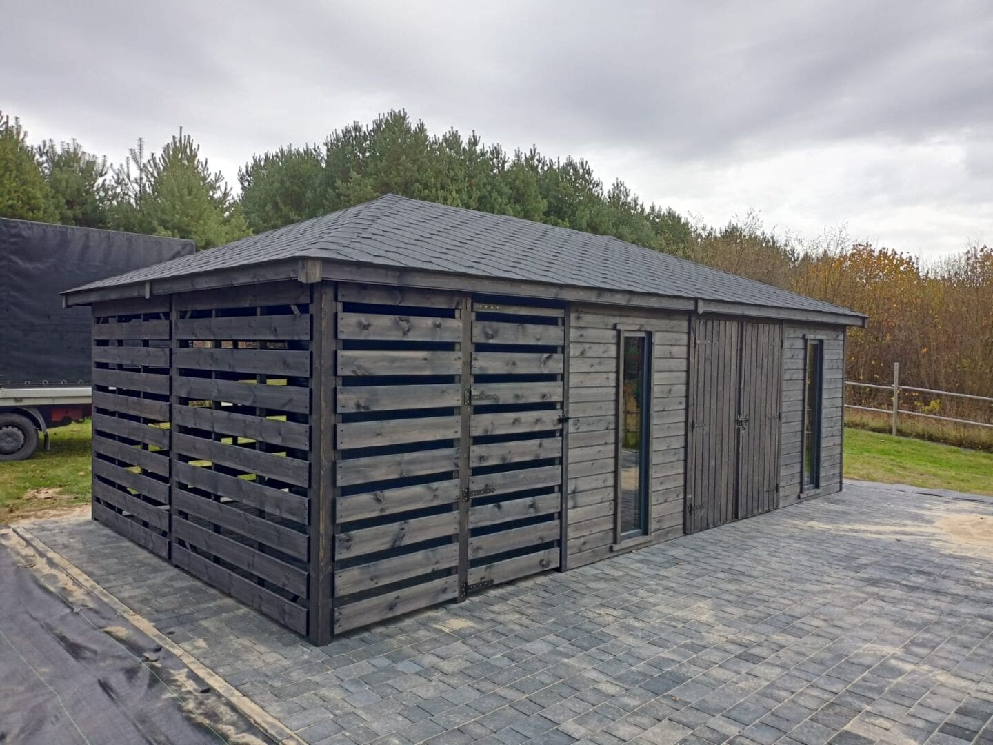 - Ścianki drewutni wykonane z deski