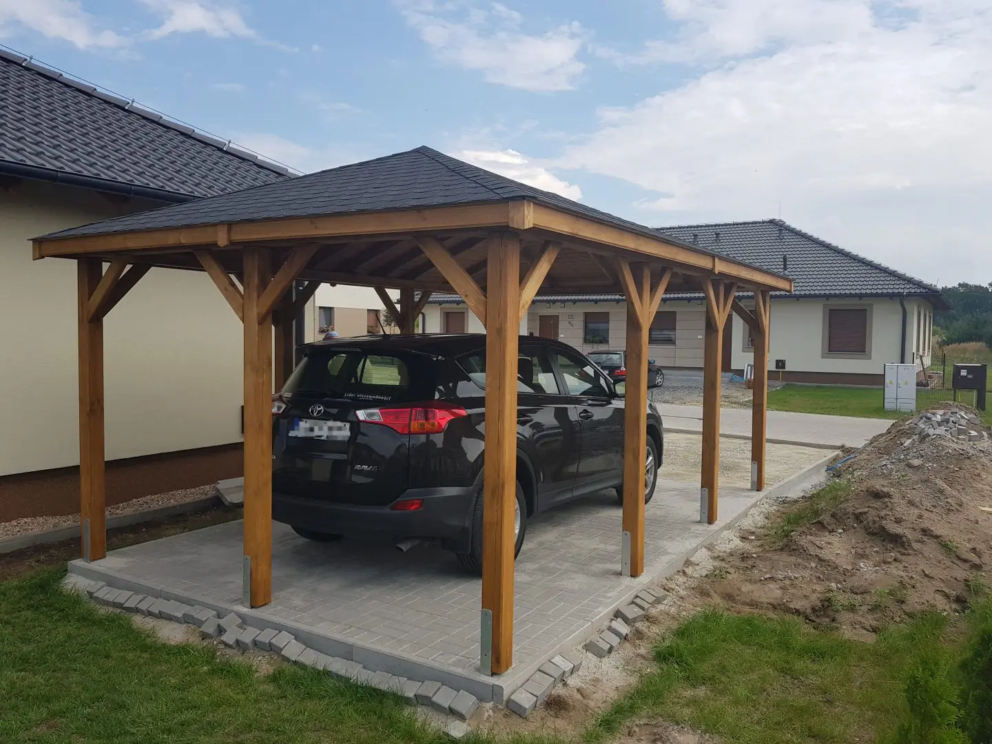 Dziękujemy za zainteresowanie naszą firmą. Mamy do zaoferowania wiatę samochodową o wymiarach 3,5m x 5,5m wykonaną z drewna sosnowego. Wszystkie elementy drewniane są staranie szlifowane oraz frezowane. W trosce o klienta oferujemy drewno suszone komorowo. Zapraszamy do zapoznania się z naszą ofertą, a przekonacie się, Państwo że to dobry wybór. Wykonujemy konstrukcje pod wymiar Klienta , wiatę można konfigurować w dowolny sposób. Udzielamy pisemnej gwarancji.