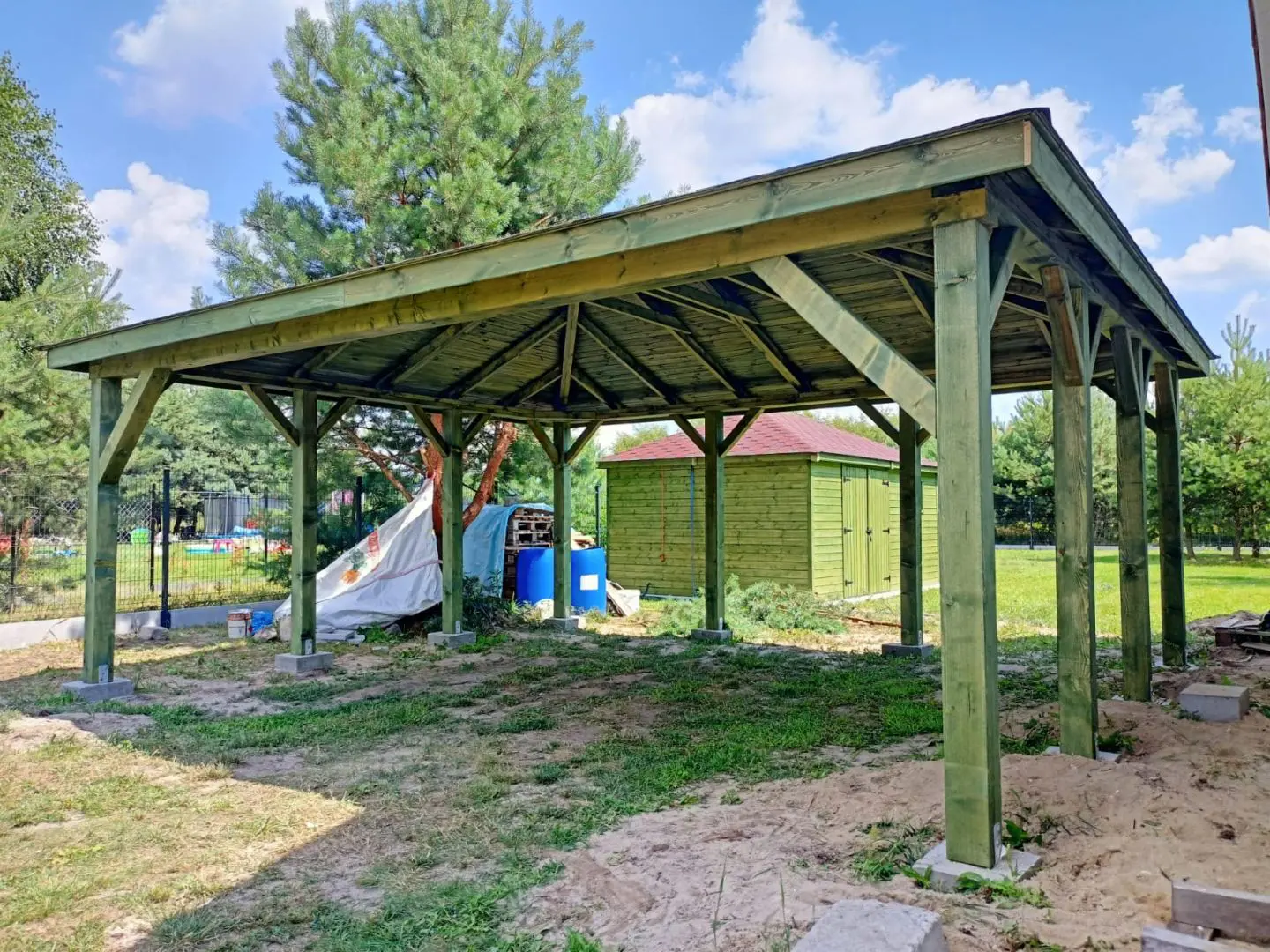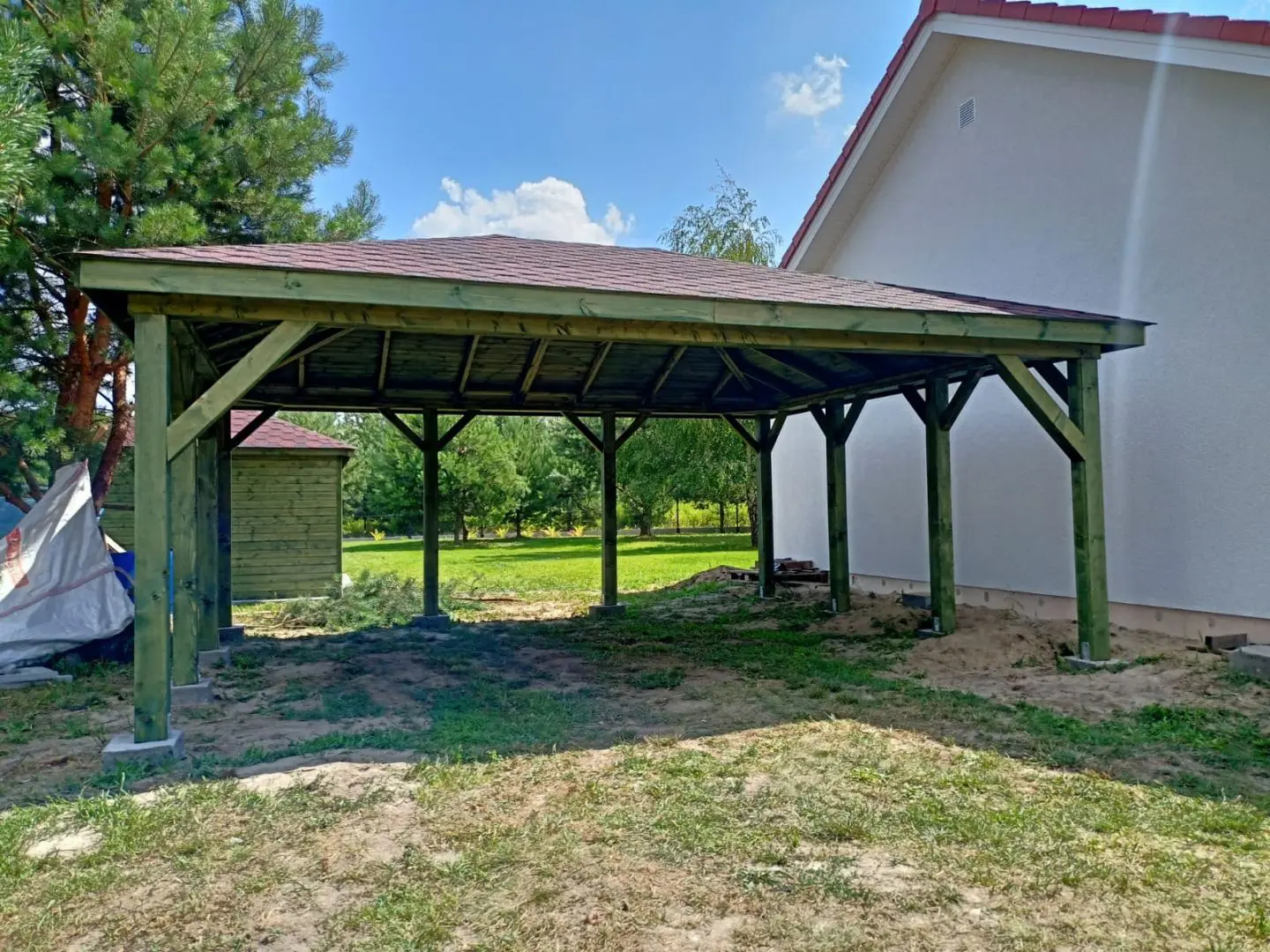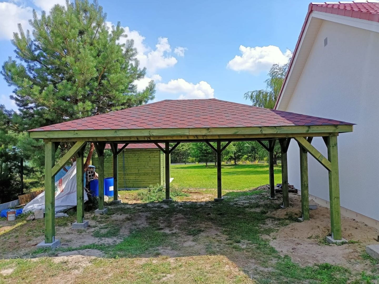 Dziękujemy za zainteresowanie naszą firmą. Mamy do zaoferowania wiatę samochodową o wymiarach 5m x 6m wykonaną z drewna świerkowo-sosnowego. Wszystkie elementy drewniane są staranie szlifowane oraz frezowane. W trosce o klienta oferujemy drewno suszone komorowo. Zapraszamy do zapoznania się z naszą ofertą, a przekonacie się, Państwo że to dobry wybór. Wykonujemy konstrukcje pod wymiar Klienta , wiatę można konfigurować w dowolny sposób. Udzielamy pisemnej gwarancji.