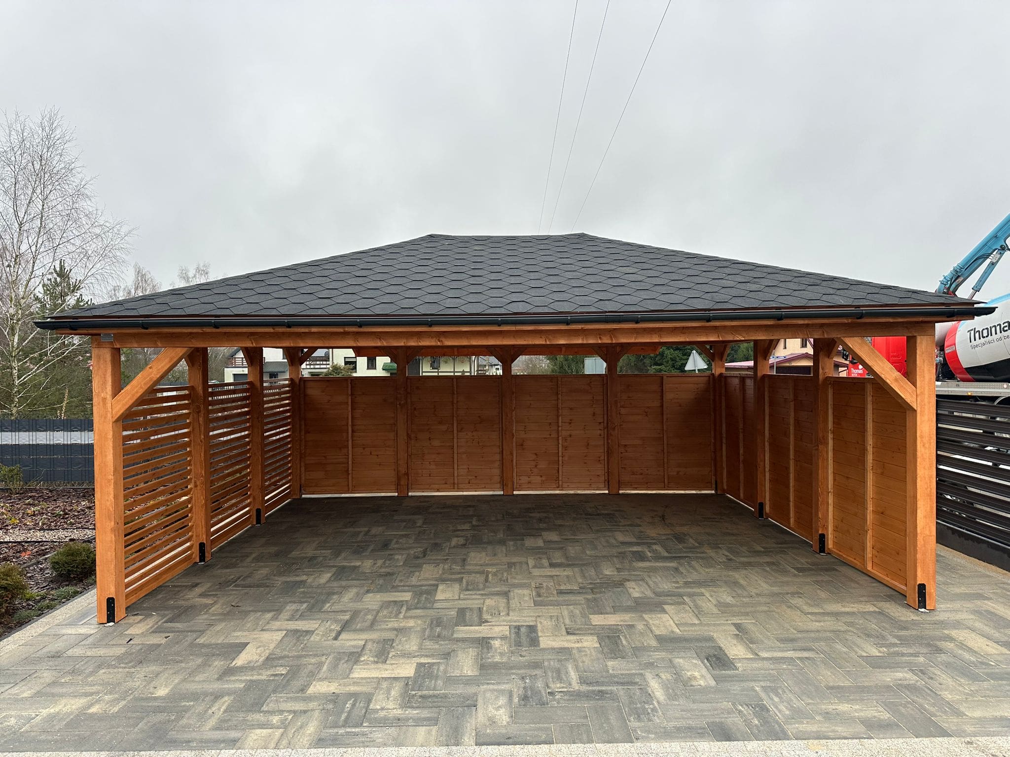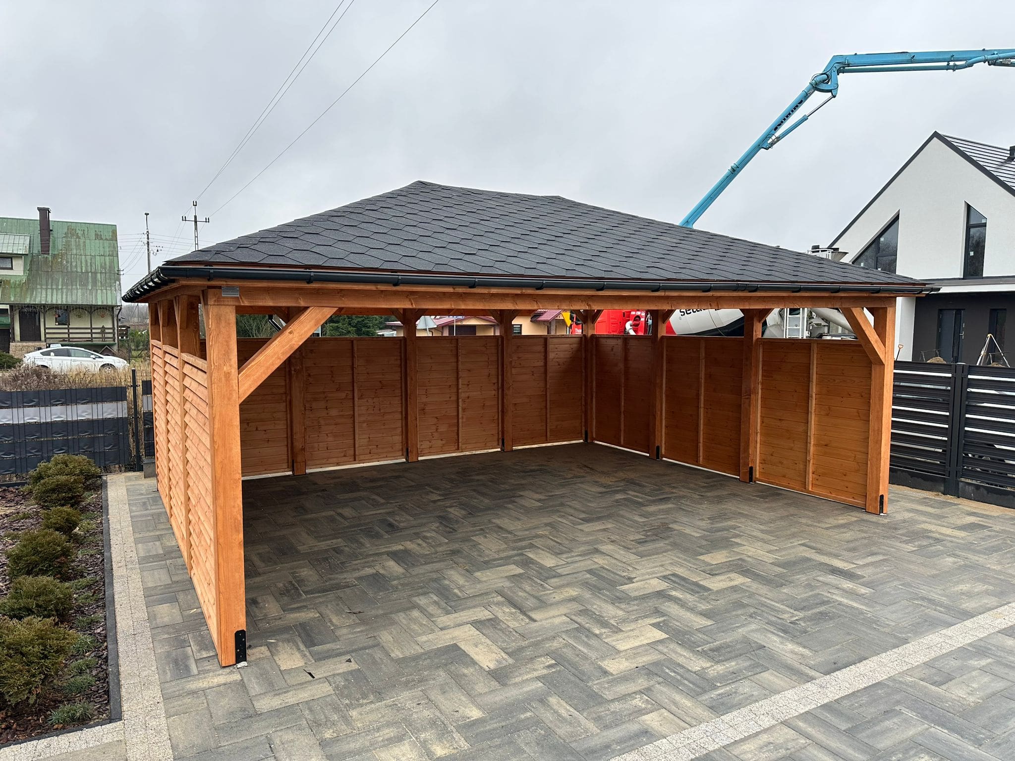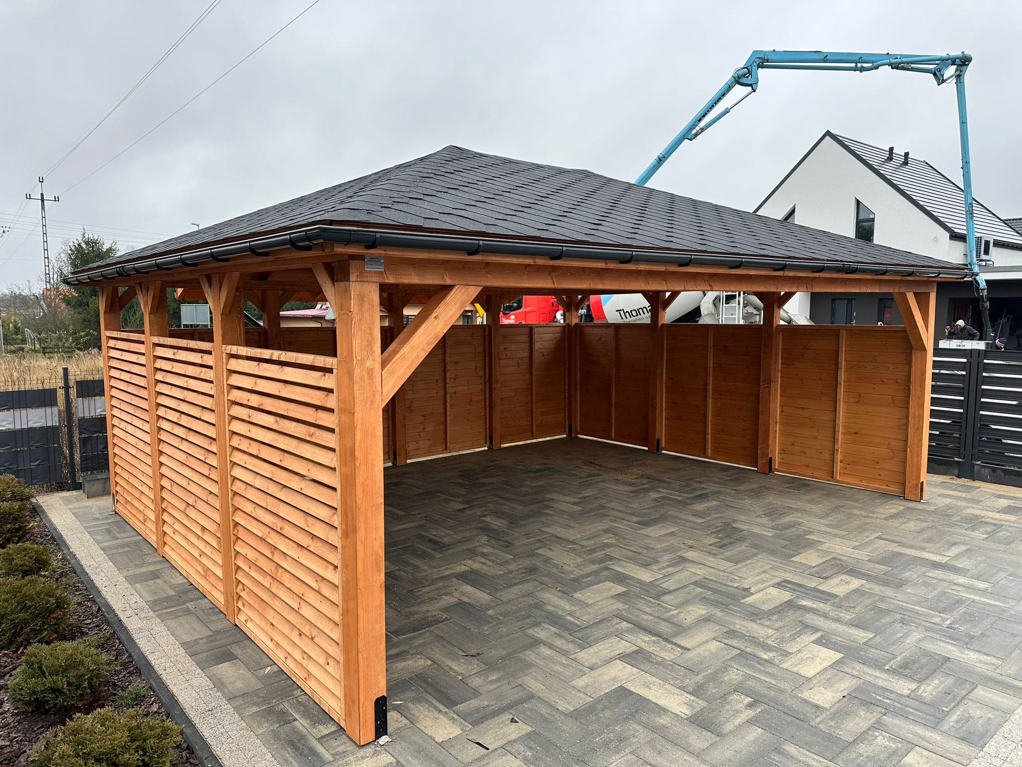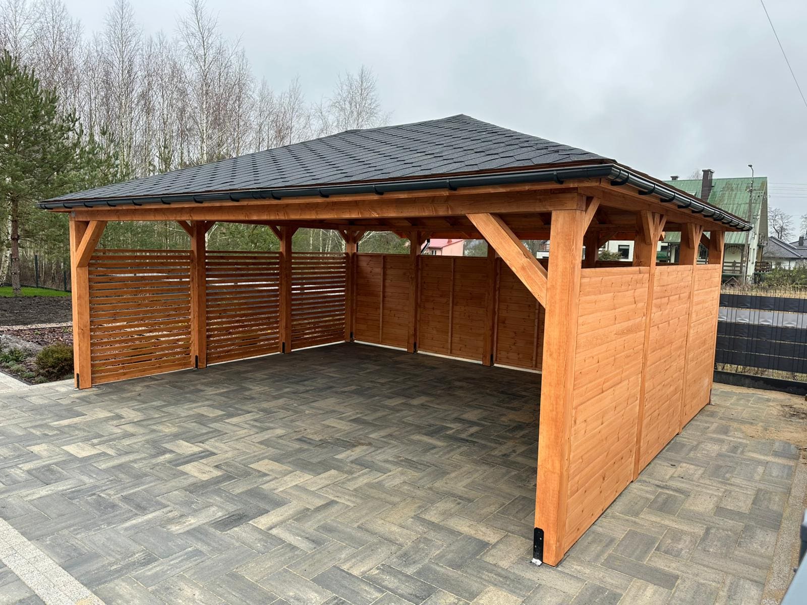 Wiata samochodowa „JULIA 2” 5×6,5 m to rozbudowana, zabudowana forma zadaszenia, która daje dużo więcej niż standardowa wiata. Pełniejsze ściany z tyłu i po bokach tworzą osłoniętą przestrzeń, dzięki czemu auta są lepiej chronione przed wiatrem, śniegiem i spojrzeniami z zewnątrz. Duża powierzchnia pozwala swobodnie zaparkować dwa samochody i zachować komfort manewrowania. Całość wykonana z certyfikowanego drewna świerkowego z dbałością o detale, elementy są szlifowane i frezowane, a drewno suszone komorowo zapewnia stabilność i długą żywotność.