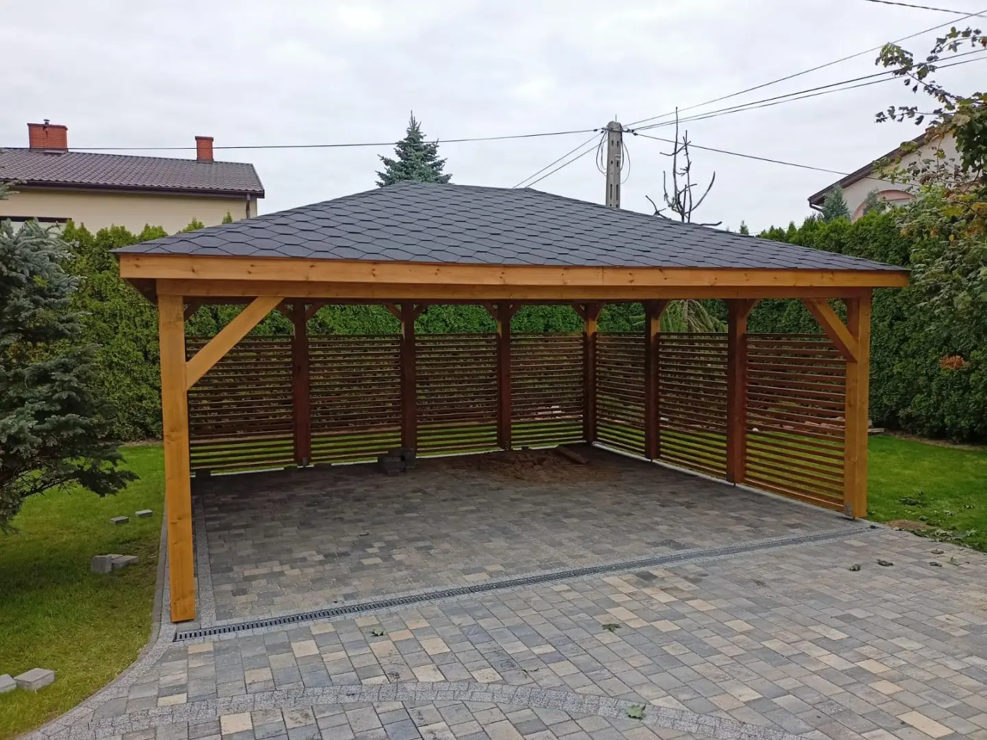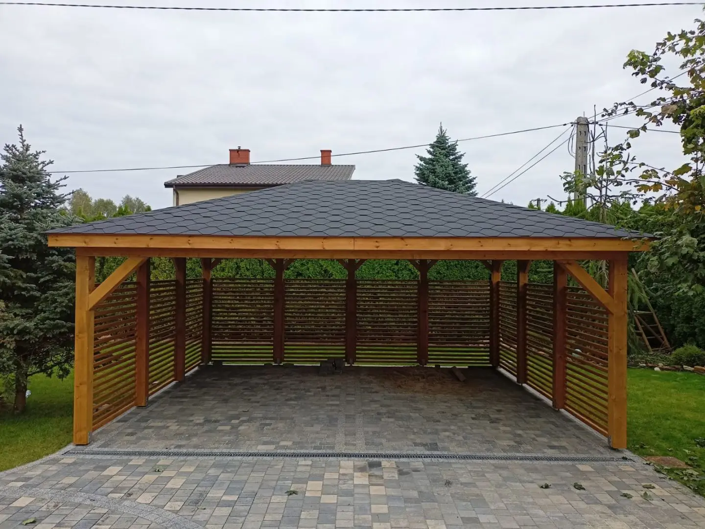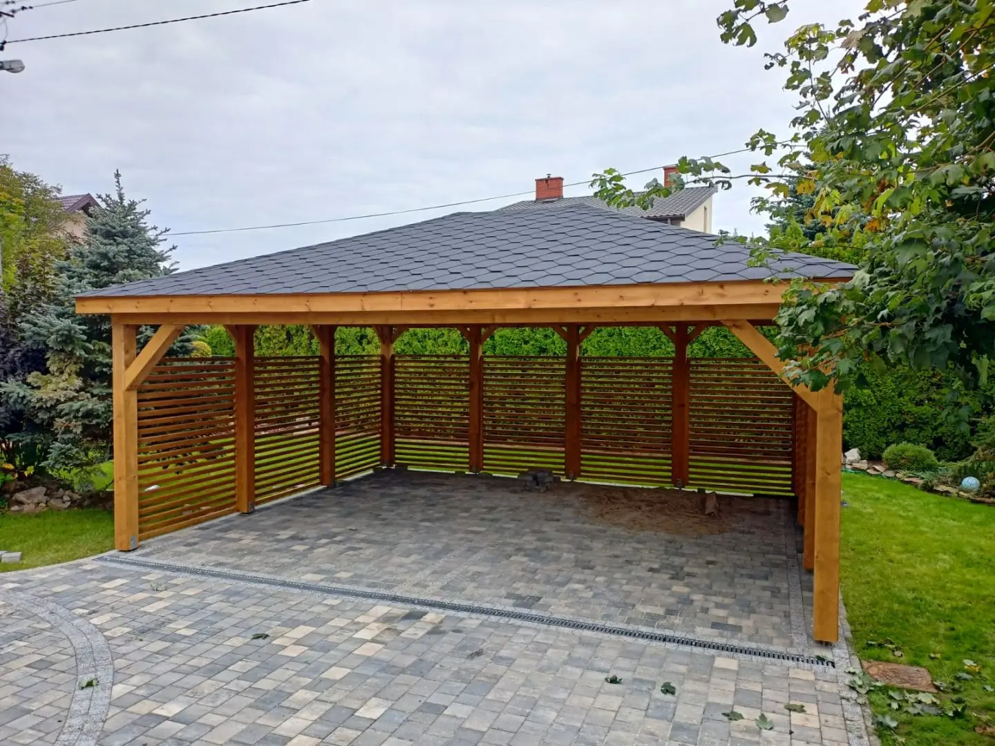 Dziękujemy za zainteresowanie naszą firmą. Mamy do zaoferowania wiatę samochodową o wymiarach 5m x 6m wykonaną z drewna świerkowo-sosnowego. Wszystkie elementy drewniane są staranie szlifowane oraz frezowane. W trosce o klienta oferujemy drewno suszone komorowo. Zapraszamy do zapoznania się z naszą ofertą, a przekonacie się, Państwo że to dobry wybór. Wykonujemy konstrukcje pod wymiar Klienta , wiatę można konfigurować w dowolny sposób. Udzielamy pisemnej gwarancji.