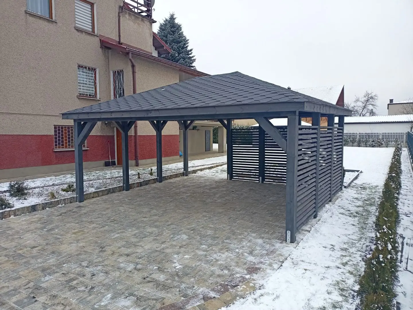 Dziękujemy za zainteresowanie naszą firmą. Mamy do zaoferowania wiatę samochodową o wymiarach 5m x 6m wykonaną z drewna świerkowo-sosnowego. Wszystkie elementy drewniane są staranie szlifowane oraz frezowane. W trosce o klienta oferujemy drewno suszone komorowo. Zapraszamy do zapoznania się z naszą ofertą, a przekonacie się, Państwo że to dobry wybór. Wykonujemy konstrukcje pod wymiar Klienta , wiatę można konfigurować w dowolny sposób. Udzielamy pisemnej gwarancji.