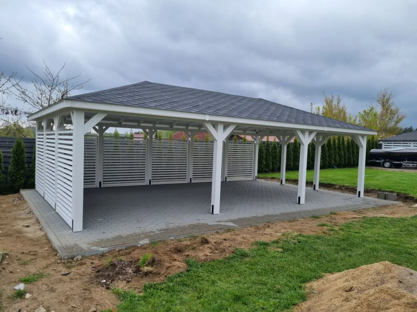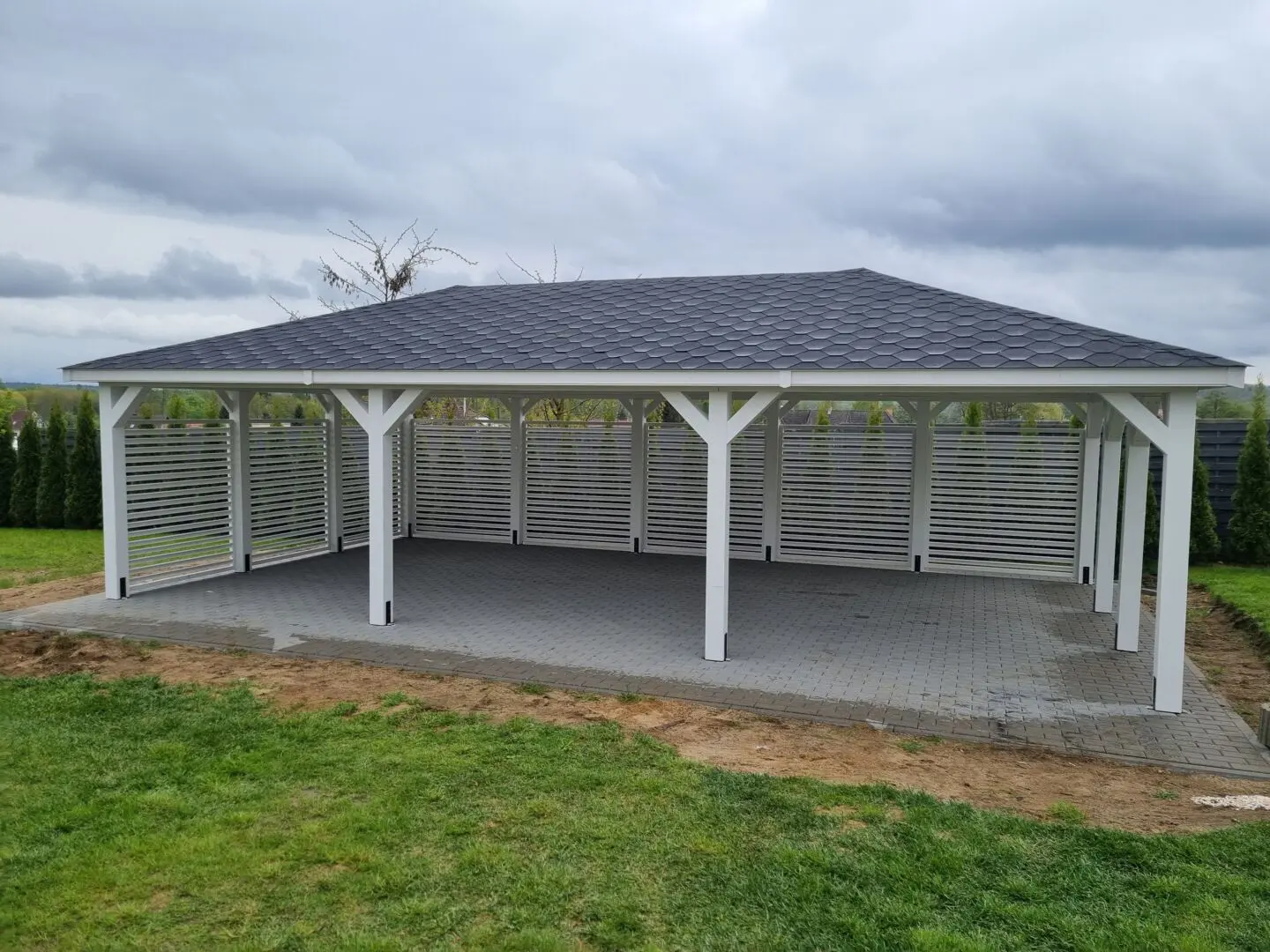Dziękujemy za zainteresowanie naszą firmą. Mamy do zaoferowania wiatę samochodową o wymiarach 5m x 9m  wykonaną z drewna świerkowego. Wszystkie elementy drewniane są staranie szlifowane oraz frezowane. W trosce o klienta oferujemy drewno suszone komorowo. Zapraszamy do zapoznania się z naszą ofertą, a przekonacie się, Państwo że to dobry wybór. Wykonujemy konstrukcje pod wymiar Klienta , altanę można konfigurować w dowolny sposób.