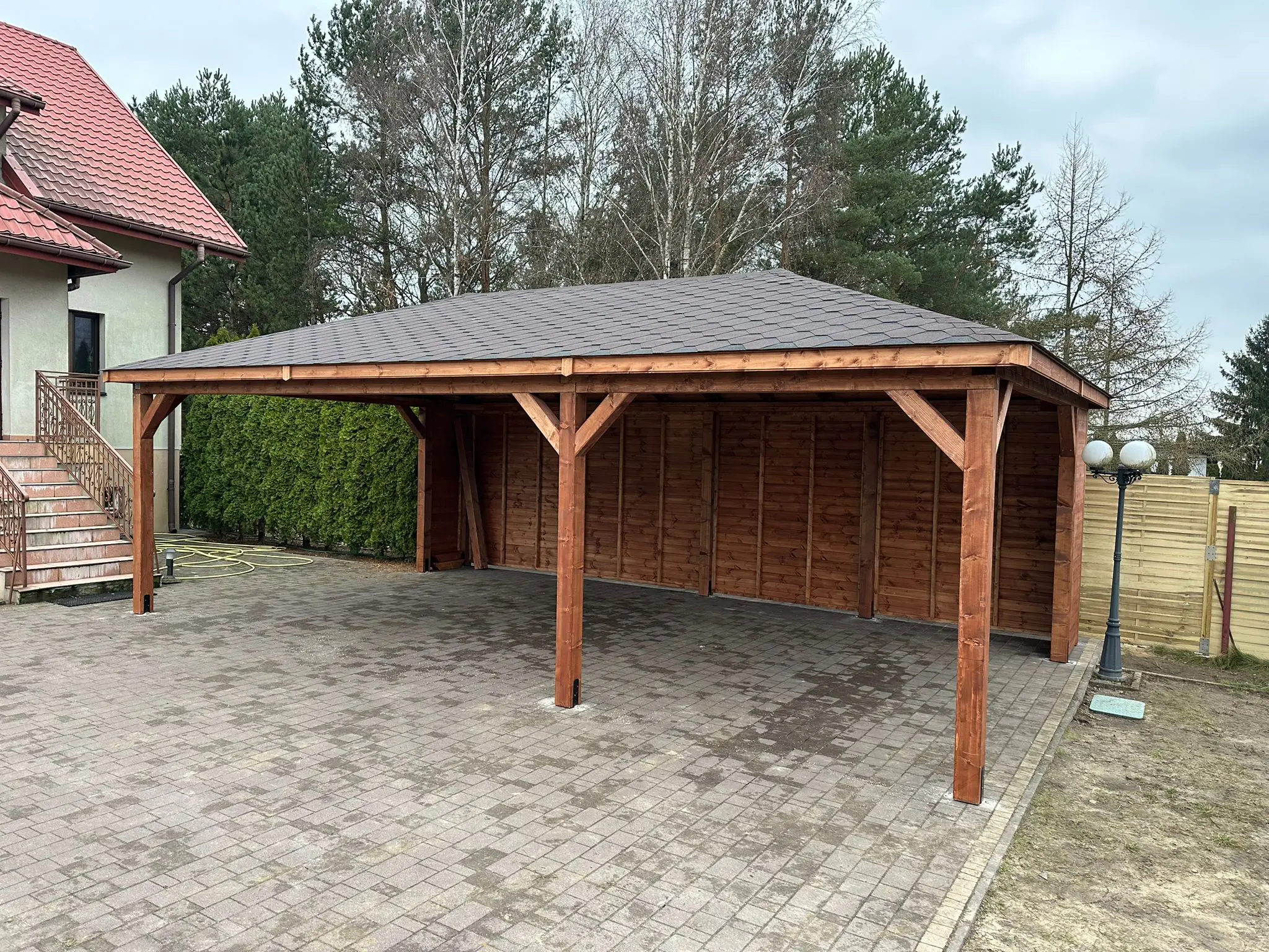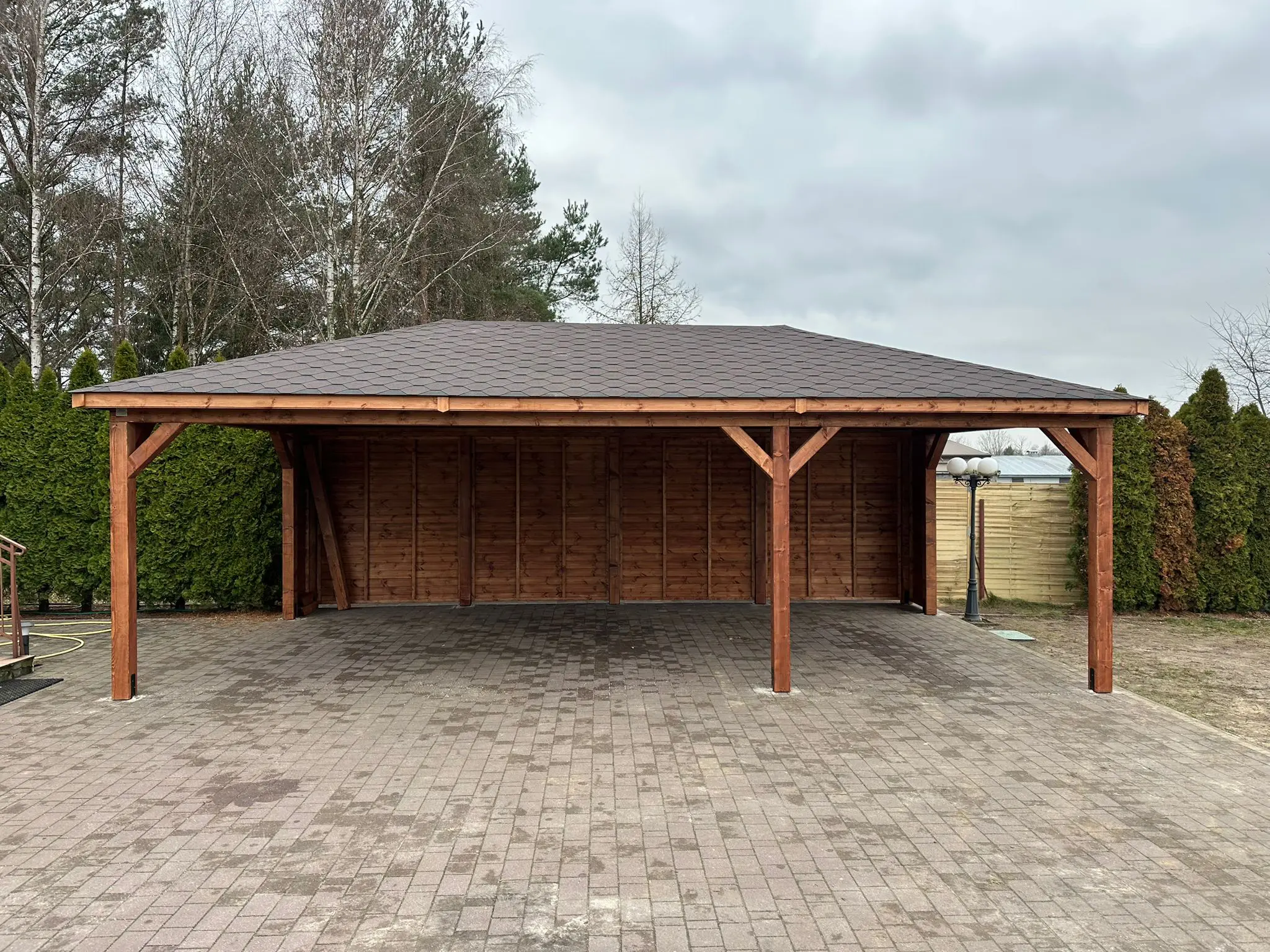 Dziękujemy za zainteresowanie naszą firmą. Mamy do zaoferowania wiatę samochodową o wymiarach 5m x 8,5m  wykonaną z drewna świerkowo-sosnowego. Wszystkie elementy drewniane są staranie szlifowane oraz frezowane. W trosce o klienta oferujemy drewno suszone komorowo. Zapraszamy do zapoznania się z naszą ofertą, a przekonacie się, Państwo że to dobry wybór. Wykonujemy konstrukcje pod wymiar Klienta , wiatę można konfigurować w dowolny sposób. Udzielamy pisemnej gwarancji.